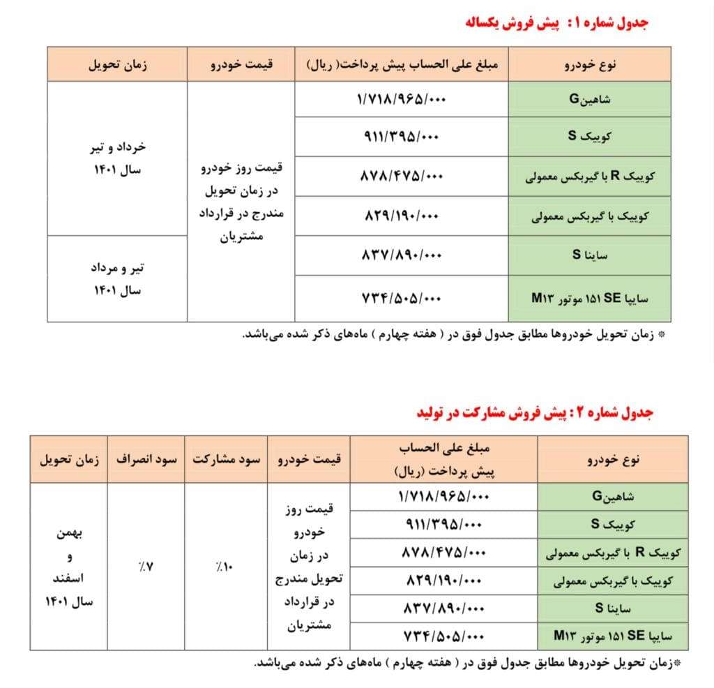 در شرایط پیشفروش یکساله سایپا، خودروهای شاهین G، کوییک S، کوییک دندهای، کوییک R دندهای، ساینا S و پراید وانت یا سایپا ۱۵۱ عرضه شدهاند. موعد تحویل خودروها خرداد الی مرداد ۱۴۰۱ است و قیمت خودرو نیز مطابق قیمت روز در زمان تحویل محاسبه خواهد شد.